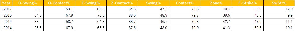 他方で,ストライクゾーンは基本的に振るべきボールです。しかし,Z-Swing%は62.8%とここ3年と比較すると最低の数値です。しかも,ストライクゾーンを振りにいって,当たる確率(Z-Contact%)が84.3%とここ3年と比較すると最低になっています。